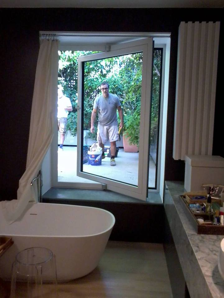 Qui sotto trovate un porta finestra a bilico verticale, anta unica, bicolore. Era fondamentale avere un ingombro ridotto e mantenere il colore esterno uniforme con il resto degli infissi. Qui ha giocato meno la parte tecnica dell'infisso, fondamentale estetica